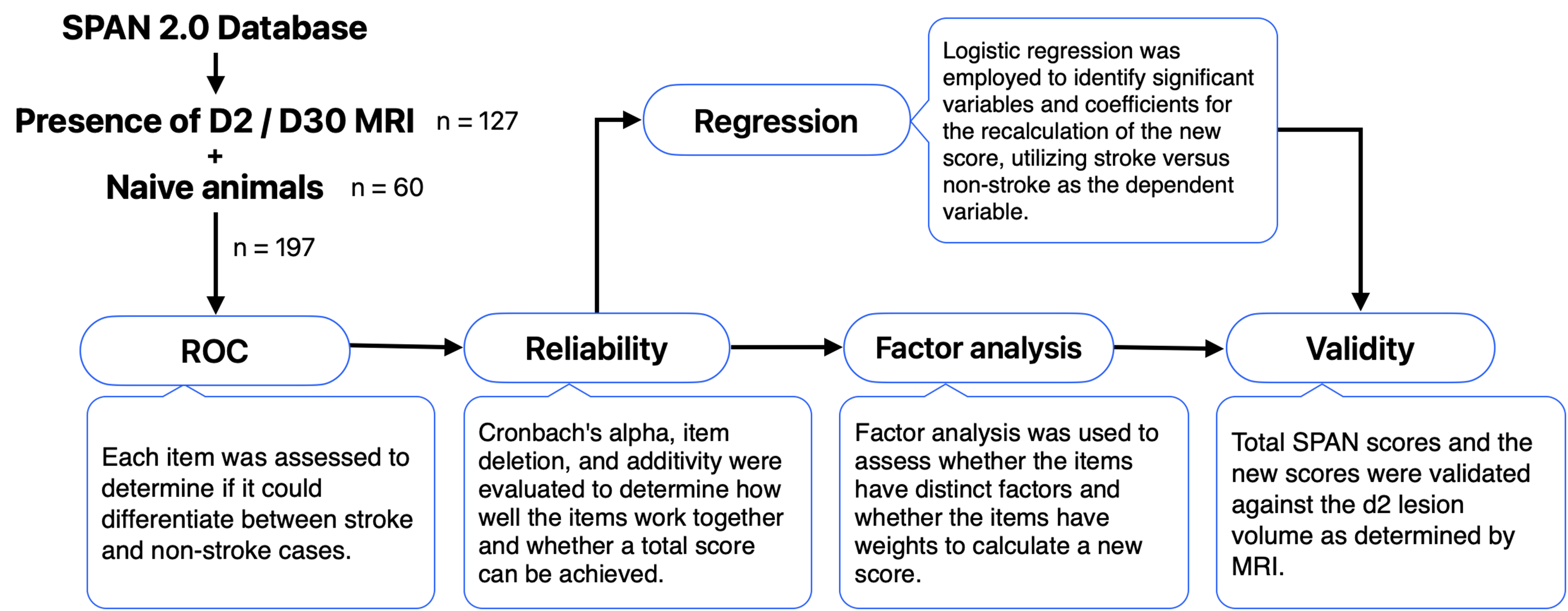 The SPAN 2.0 pilot database was utilized for analysis. ROC analysis was done for each item to evaluate whether stroke vs. non-stroke can be detected. Reliability was assessed using Cronbach's alpha (a) and intraclass correlation coefficient (ICC) for individual items and the total score Explanatory factor analysis/logistic regression was performed to select items and determine their weight. Concurrent validity was examined by correlating post-operative day 2 Infarction volume as measured by MRI with the SPAN score.
