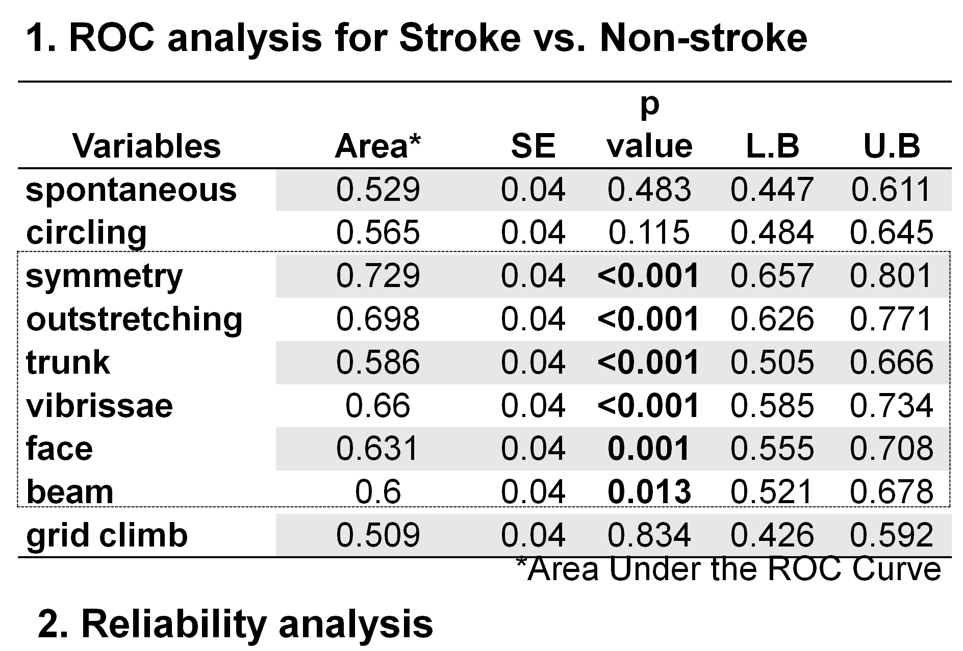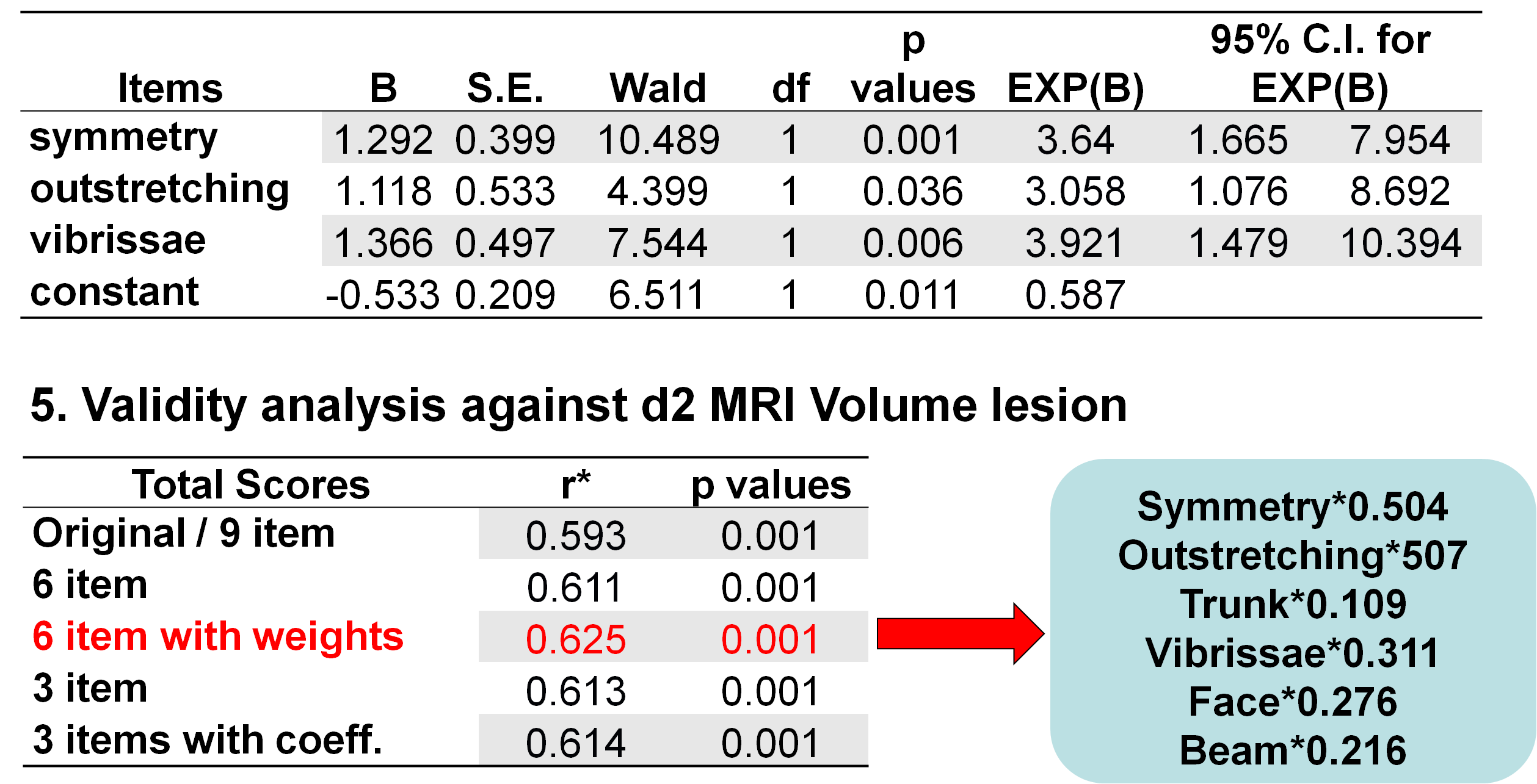 After conducting ROC, reliability, logistic regression, and factor analysis to predict day 2 infarction volume measured by MRI, a six-item score using symmetry, outstretching, trunk, vibrissae, face, and beam multiplied by coefficients obtained from explanatory factor analysis was the most reliable and valid